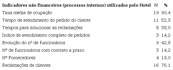 Na Tabela 10, evidenciam-se os indicadores não financeiros (processos internos) e verifica-se que os indicadores mais utilizados foram o de Taxa média de ocupação (90,4%) e reclamações de clientes (76,1%), seguidos dos indicadores tempo de atendimento do pedido do cliente (52,3%) e evolução do número de funcionários (42,8%). Índice de atendimento completo de pedidos e Nº de funcionários com contrato a prazo (ambos com 14,2%) são os indicadores que se apresentam como os menos utilizados.