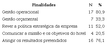 A Tabela 12 apresenta a percepção dos gestores dos hotéis quanto ao uso dos indicadores, e a maioria dos gestores afirma que a grande finalidade dos indicadores é a gestão operacional (80,9%), seguido do objetivo de atingir os resultados pretendidos (76,1%) e do objetivo de rever a política estratégica da empresa (52,0%).