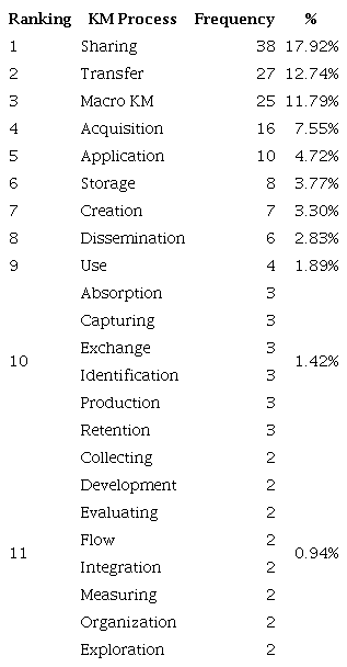 In third place appears “Macro Knowledge Management”, with 25 occurrences, 11.79% of the total. In fourth appears the process of knowledge acquisition, with 16 cases. The following is the ranking of occurrences of KM processes in the 107 articles and the most prominent: knowledge application (ten occurrences), knowledge storage (eight), knowledge creation (seven), knowledge dissemination (six), and knowledge use (four).