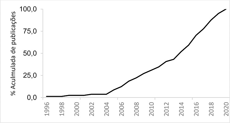 Foram identificadas 81 publicações produzidas entre os anos 1996 e 2020, que abordaram algum aspecto do impacto que a atividade turística causa no ambiente recifal e notou-se um crescimento considerável do número de publicações nos últimos anos (Figura 1).