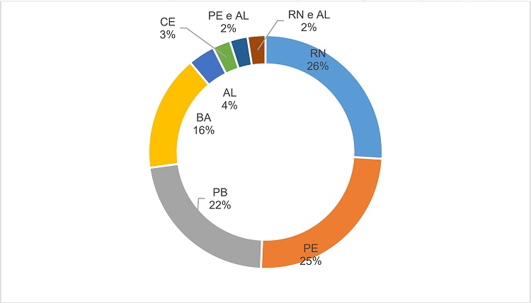 Mais da metade dos estudos foram conduzidos dentro de áreas protegidas (58%). Os estudos foram oriundos da literatura cinza (37%), publicações nacionais (32%) e publicações internacionais (30,8%). Alguns trabalhos abarcaram como área de estudo mais de um estado do Brasil, sendo Rio Grande do Norte (RN) o estado com maior número de estudos (25,9% das publicações), seguido de Pernambuco (PE) (24,7%) (Figura 2). No Maranhão não foram encontrados trabalhos com este foco, mesmo possuindo o Parcel de Manoel Luís e eventualmente, recebendo turistas para mergulho. Já Amapá, Pará, Piauí e Sergipe não possuem recifes na sua região litorânea.