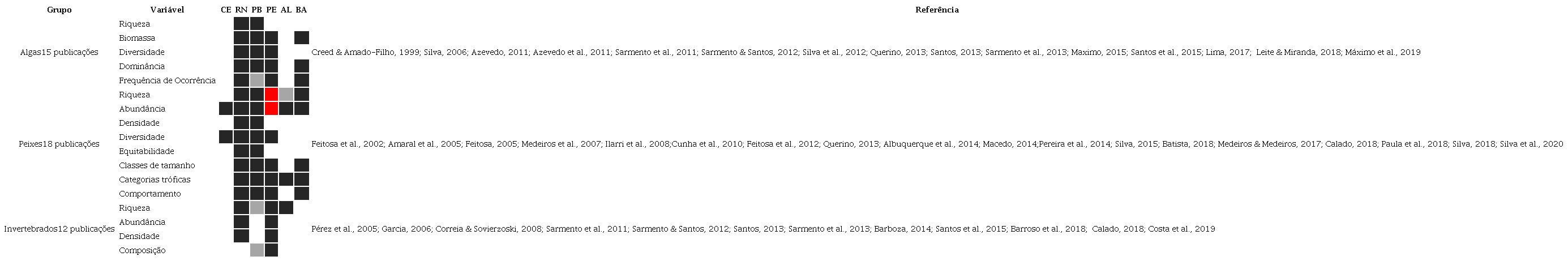 Cada publicação foi analisada de acordo com: (i) ano da publicação, (ii) periódico da publicação ou universidade, no caso de trabalhos de literatura cinza, (iii) área geográfica de enfoque do estudo (estado brasileiro) (iv) grupos biológicos estudados (algas, peixes, invertebrados, coral duro, coral mole e outros), (v) variáveis biológicas estudadas (ex. riqueza, biomassa, diversidade, dominância, abundância, densidade, classes de tamanho, categorias tróficas, entre outras), (vi) outros aspectos (ex. variáveis abióticas, serviços ecossistêmicos, impactos ambientais, comportamento dos mergulhadores, percepção ambiental, educação ambiental).