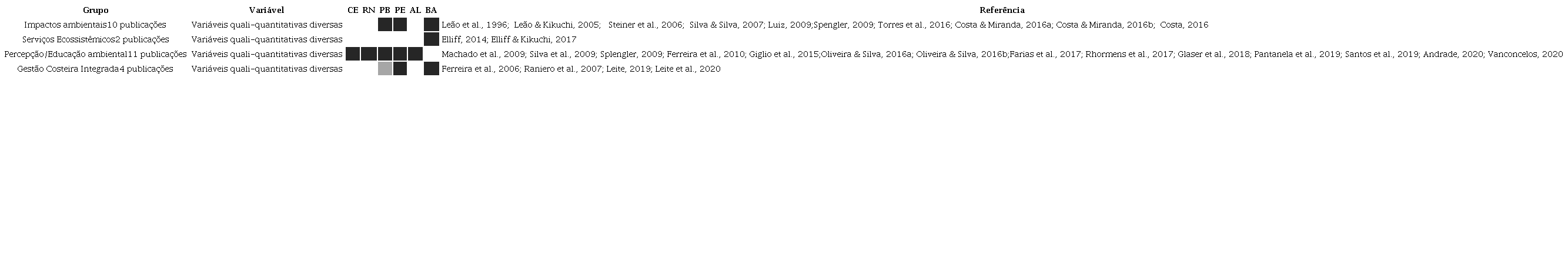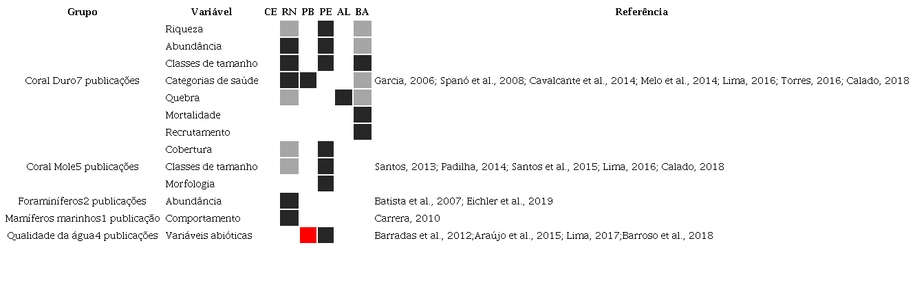 O presente trabalho centrou em analisar pesquisas em ambientes recifais tropicais, embora existam outros estudos em costões rochosos do litoral sul e sudeste do Brasil desenvolvidos com abordagens semelhantes (Giglio et al., 2017a, b; Giglio et al., 2018; Pedrini, 2006; Pedrini et al., 2008; Pedrini et al., 2015).