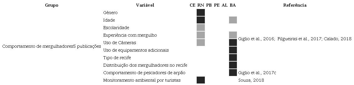 Estudos com grupos específicos ocorreram apenas no RN. Já as pesquisas mais amplas, que abordaram os impactos ambientais em geral, com uma discussão ecossistêmica ou de gestão costeira integrada, foram realizadas em PE, PB e BA. Trabalhos com percepção e educação ambiental foram encontrados no CE, RN, PB, PE e AL e a compreensão do comportamento de mergulhadores apenas no RN e na BA.