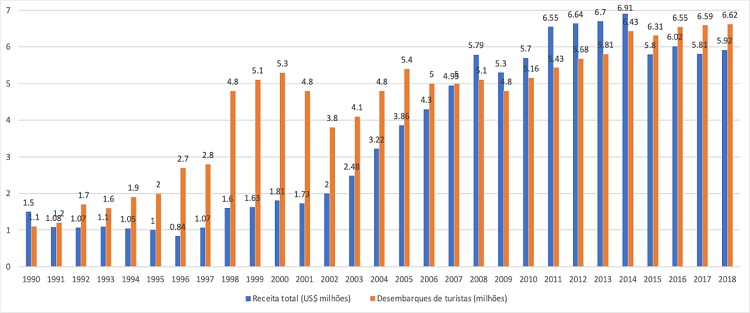 Como ocorre em outras economias nacionais, as atividades turísticas no Brasil são suscetíveis ao desempenho macroeconômico do país. Desde a década de 1990, quando o Brasil entrou em uma era de redemocratização, tentativas foram feitas para superar os problemas do setor. Esses esforços incluem o desenvolvimento e consolidação do turismo como uma atividade econômica e social. No entanto, segue o problema de transformar a atual oferta de infraestrutura turística em um produto a ser disponibilizado ao público consumidor, incluindo a necessidade de melhorar a mobilidade urbana e de longa distância bem como os níveis de segurança, diminuir as taxas de criminalidade e melhorar a capacidade do país de atrair investimentos internos e externos. A Figura 1 mostra uma significativa mudança no volume de ingresso na balança cambial em 2003, rompendo a barreira dos US$ 2 bilhões anuais. O aumento constante identificado até 2008 foi resultado direto da implementação do Plano Aquarela por parte da Embratur (Instituto Brasileiro de Turismo - veja seção 5), ao focar na captação e promoção internacional de eventos (vide seção 7). Enquanto o número de turistas internacionais se manteve na faixa de 5 milhões, a receita gerada aumentou quase três vezes nesse período. Os esforços que têm sido feitos neste sentido refletem-se em dois indicadores-chave: a receita gerada pelo setor e o número total de desembarques internacionais (Figura 1).