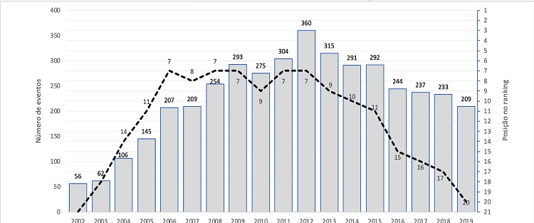 A aposta do país em atração de congressos, convenções e eventos como instrumento de formação de uma opinião pública internacional de melhor qualidade a respeito do Brasil, formulada a partir de 2003-2004, mostrou-se correta conforme pode ser verificado nas Figuras 1 e 2, ao ficar demonstrado o crescimento do número de eventos e de cidades recebendo estes turistas, além do maior ingresso de receita cambial em dólares, com pouco crescimento do número de passageiros. Praticamente também permitiu substituir os assentos perdidos pela quebra de uma tradicional companhia aérea, a Varig, em 2003, por novas rotas e empresas conectando o Brasil ao exterior. Isso resultou na mudança do tradicional turista de lazer, que o país tinha buscado atrair ao longo das décadas até então, sendo complementado por viajantes de eventos com gastos bastante superiores. Os voos da TAP ligando primeiro o Nordeste brasileiro e depois novos destinos do Sul e Sudeste brasileiro, tais como Belo Horizonte, com a Europa, entre 2004-2015/16, reforçam ainda mais estes dados.