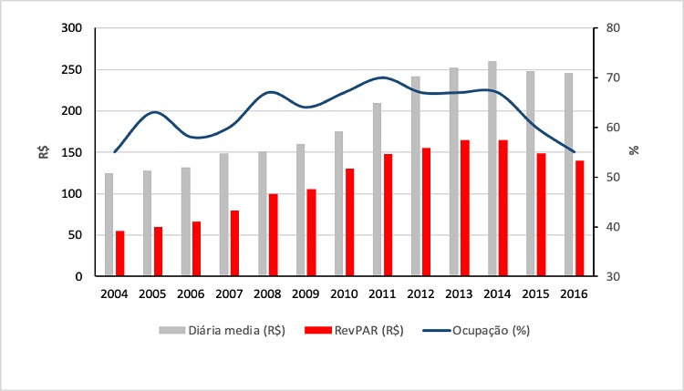 Em geral, a evolução dos indicadores de desempenho da hotelaria segue a evolução do PIB Nacional. A evolução da taxa de ocupação entre os anos de 2002 e 2012 segue tendência relativamente próxima ao PIB (FOHB, 2018). O mercado hoteleiro no Brasil sofreu impactos externos negativos no período 2001-2003, ocasionado pelo crescimento econômico interno e as crises externas, que reduziram o fluxo de chegadas de turistas internacionais, resultando no declínio da taxa média de ocupação e o fechamento de alguns hotéis (Gorini & Mendes, 2005).