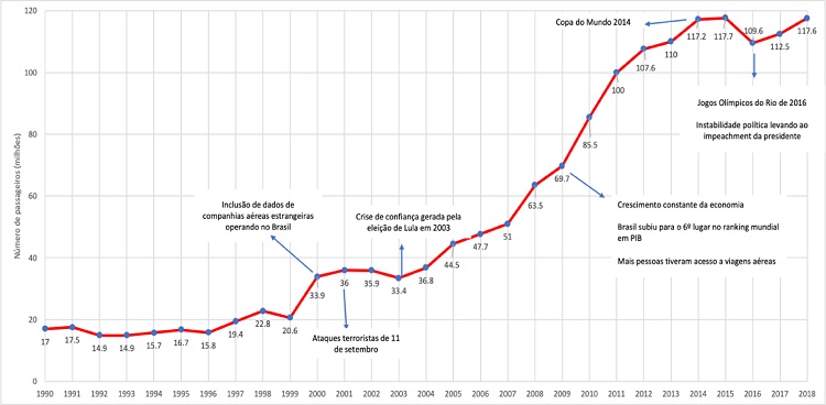 A Figura 5 apresenta o tráfego de passageiros em aeroportos brasileiros no período de 1990 a 2018. Após os ataques terroristas de 11 de setembro de 2001 nos EUA, o Brasil experimentou certos impactos entre 2002 e 2003. Os anos seguintes foram positivos para a economia brasileira, que se tornou a sexta maior economia global medida pelo PIB. Essa prosperidade possibilitou mais viagens aéreas pelo extenso país. Em 2014, quando o Brasil sediou a Copa do Mundo, o número de passageiros aumentou em quase 7%, uma vez que os jogos foram disputados em 12 estados distintos. Em 2015, este mercado continuou a crescer após o evento esportivo. No entanto, esse número de passageiros caiu de quase 118 milhões para 109 milhões em 2016, ano dos Jogos Olímpicos, sediados no Rio de Janeiro. Essa queda foi causada principalmente pelas crises política e econômica que ocorreram (para mais informações, ver outras seções deste artigo), enfatizando que a instabilidade política e econômica do Brasil travou o país, a despeito da oportunidade única de desfrutar de um grande evento esportivo para posicionar o país como um destino turístico global.