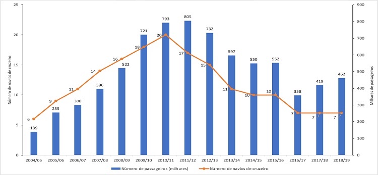 A Figura 6 ilustra o aumento no número de passageiros, iniciado em meados dos anos 2000, decorrente dessas mudanças regulatórias e da atração por parte de cruzeiros de turistas brasileiros e internacionais. A temporada de cruzeiros de verão no Brasil geralmente começa em meados de novembro e termina por volta de março/abril do ano seguinte. Posteriormente, os navios de cruzeiro mudam para o hemisfério norte para a temporada de verão. De apenas seis navios e 139.000 passageiros na temporada 2004-2005, este setor cresceu para 20 navios em 2010-2011 e 805.000 passageiros em 2011-2012. A partir da temporada 2011-2012, o número de navios e, consequentemente, o número de passageiros começou a diminuir, principalmente em função dos elevados custos incorridos nos portos brasileiros. Ainda que o número de navios permanecesse o mesmo (n = 7), em 2017-2018 o número de passageiros voltou a aumentar, embora gradativamente. Esse aumento é demonstrado no número de leitos do setor, já que armadoras de cruzeiros passaram a trazer navios maiores a cada ano. Em 2019-2020, o número de leitos aumentou 6,3%, para mais de 500.000 (CLIA Brasil, 2019).