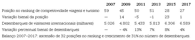 Desde 2007, o Brasil se tornou mais competitivo, subindo 32 posições no ranking global de Competitividade em Viagens e Turismo (Tabela 1). Esta foi a consequência do que o World Bank (2015) classificou como “Década de Ouro (2003-2013)” assim como investimentos adicionais realizados em infraestrutura associada à realização e organização de grandes eventos esportivos. Nas diversas edições do Travel and Tourism Competitiveness Report do World Economic Forum, o Brasil tem sido reconhecido por seus recursos naturais, obtendo nota superior a qualquer outro país. No entanto, o ambiente de negócios no Brasil merece nota negativa, pois seus atributos de competitividade relacionados a esse tema têm permanecido fracos.