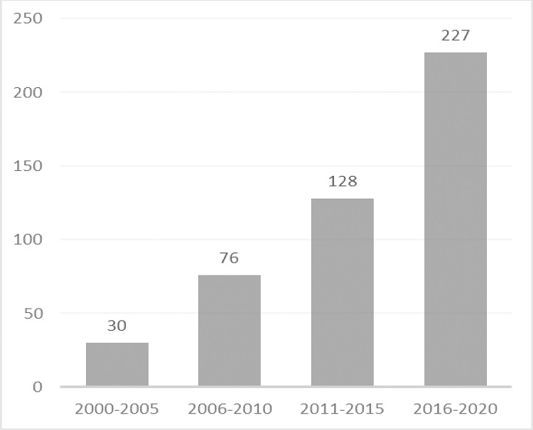 O interesse pelos estudos sobre a demanda turística tem se revelado no número crescente de trabalhos nessa área, considerada fundamental no entendimento do fenômeno turismo. Tal fato pode ser identificado nas buscas de artigos empíricos nas bases com o termo “demanda turística” (em português, espanhol e inglês), entre 2000 e março de 2020. Neste período houve um aumento significativo das publicações sobre a demanda turística, antes mesmo do processo de filtragem e seleção dos artigos como relatado na próxima seção de metodologia. Os artigos levantados sobre o tema chegaram a 227, entre 2016 e março de 2020, mais de 77% da quantidade registrada nos 5 anos anteriores. Entre 2006 e 2010 o acréscimo de estudos de demanda foi maior que 100%, em relação aos 5 anos anteriores. Pode-se observar na Figura 1 um aumento crescente das publicações no período analisado.