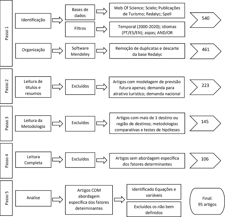 O objetivo principal foi identificar publicações acadêmicas, em nível global, entre os anos de 2000-2020 que explorem os determinantes da demanda turística, associados à utilização de modelos de análise e de previsão. Inicialmente foram identificados 540 artigos que foram incluídos no software organizador de referências Mendeley, 79 duplicatas foram suprimidas selecionando 461 artigos para a leitura de títulos e resumos. Na segunda etapa, a pesquisa foi restrita a busca de estudos empíricos que utilizassem modelos estatísticos ou econométricos tendo como foco de estudo a demanda turística internacional para um único destino (cidade, estado ou país). Nesta etapa foram descartados mais 238 artigos e selecionados 223. Na terceira etapa realizou-se a leitura da metodologia dos estudos, excluindo os artigos que abordavam a demanda para mais de um destino ou região turística ou que tinham outro objetivo de análise do turismo (como, por exemplo, para competitividade e perfil do turista). Após o processo de análise, 68 artigos foram excluídos, ficando 145 para a quarta etapa. Desta vez foi feito a leitura completa dos estudos, excluídos aqueles que não apresentavam abordagem específica dos fatores determinantes, selecionando-se 106 para a etapa final. Por fim, na quinta etapa foram excluídos mais 11 estudos que não descreviam as variáveis exploratórias, o que não impossibilitaria a relação com os modelos utilizados. A sistematização do processo está representada na figura 2.