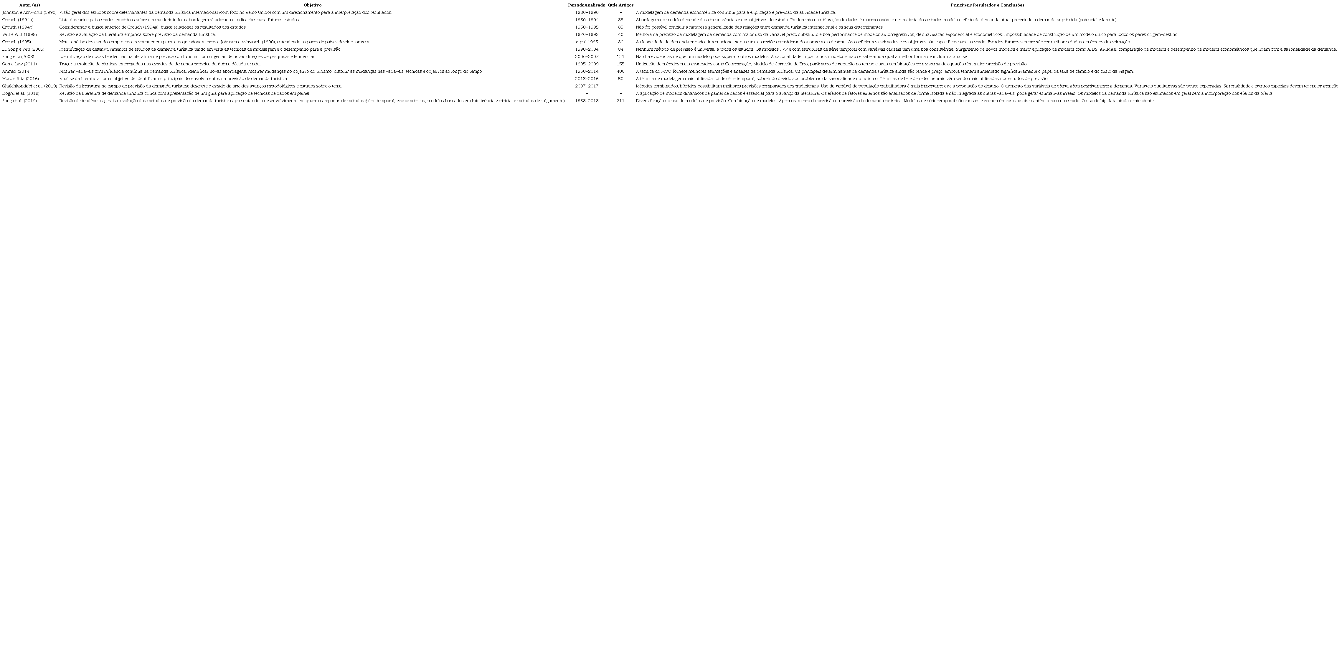 O primeiro trabalho sobre a demanda turística data da década de 1960 e foi realizado por Guthrie (1961 como citado em Li, Song, & Witt, 2005). A maioria dos estudos relacionada a demanda turística está associada a utilização de métodos e modelos de previsão. Os estudos de modelagem versam sobre aplicações empíricas com testes de hipóteses e identificação dos principais fatores determinantes que influenciam a demanda turística (Li et al, 2005). Com o avanço da pesquisa na área, alguns autores (Johnson & Ashworth, 1990, Witt & Witt, 1995, Crouch, 1994a, 1994b, Li et al, 2005, Song & Li, 2008, Goh & Law, 2011, Ahmed, 2014, Moro & Rita, 2016, Ghalehkondabi, Ardjmand, Young, & Weckman, 2019, Dogru, Bulut, & SirakayaTurk, 2019, Song et al, 2019) se dedicaram a compilar as principais formas de análise em estudos empíricos da demanda turística e de previsão. Esses estudos, seus objetivos, período analisado e quantidade de artigos analisados, são apresentados na tabela 1.