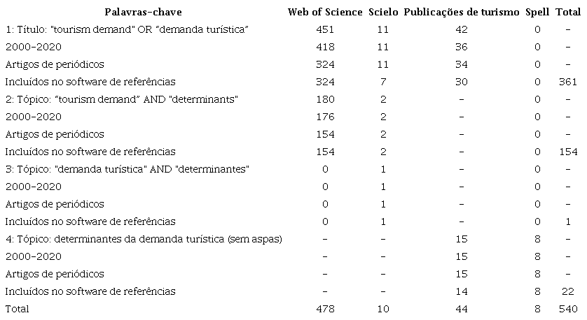 Inicialmente, optou-se por buscar estudos com a palavra-chave “demanda turística” ou “tourism demand” sem restrições, tendo um alcance bastante amplo e, como resultado, a identificação de mais de mil artigos. Já a busca da palavra-chave “determinantes da demanda turística” se apresentou como bastante limitante e não teve alcance de artigos. Para refinar a busca, foram feitas quatro combinações de palavras-chave com a utilização de aspas e operadores booleanos nas três primeiras combinações: “tourism demand” OR “demanda turística”; “tourism demand” AND “determinants”; “demanda turística” AND “determinantes”; determinantes da demanda turística. A primeira combinação foi realizada apenas no título pois o texto deveria tratar dessa palavra-chave impreterivelmente. Já as três outras combinções foram realizadas como uso tópico com propósito de capturar artigos que utilizassem os termos no título, no resumo ou nas palavras-chave, e não exclusivamente no título, ampliando as possibilidades de capturar os artigos de interesse da pesquisa (tabela 2).