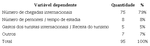 Em relação às variáveis dependentes, a análise mostra que a maioria dos estudos utiliza o fluxo de turistas como a principal variável dependente da demanda. Observou-se que 79% dos estudos analisados utilizaram o número de chegadas internacionais como variável dependente (tabela 3). Os gastos dos turistas (8%) e número de pernoites/tempo de estadia (7%) estão entre as outras variáveis utilizadas nos estudos analisados.