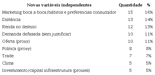 Novas variáveis independentes, não tradicionais, foram incluídas nos estudos da demanda turística internacional. Dentre as principais podemos destacar: marketing boca a boca / hábitos do consumidor (15,79%), que aparece pela primeira vez no estudo de Gaín-Muñoz e Montero-Martín (2007) e foi também encontrada no estudo de Tang (2018); distância entre o emissor e o receptor (13,68%), que podemos encontrar em Seetanah, Durbarry, Ragodoo (2010), Balli, Balli e Tangaroa (2015), Ulucak, Yucel e Ilkay (2020), e renda do destino (12,63%) (Durbarry, 2008; Seetanah & Sannassee, 2015; Xu, Wang, Li, Tang, Shao, 2019; Ulucak et al., 2020).