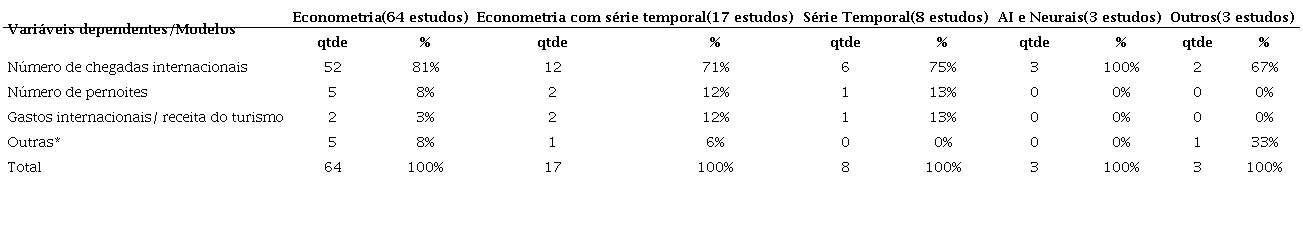 Analisando os dados apresentados na Tabela 6, constata-se que, todos os tipos de modelos (81,71%) utilizam o número de chegadas como principal variável, enquanto que, apenas 8% utilizam número de pernoites e 7%, gastos ou receita.