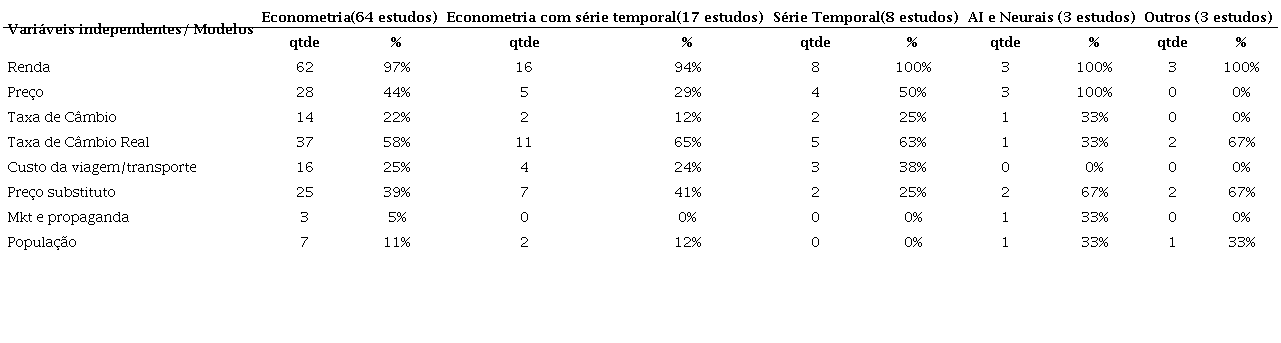 A literatura tem se diversificado na utilização de variáveis independentes para explicar o comportamento da demanda turística, como mostra a tabela 8.