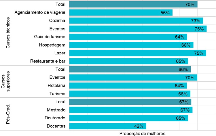 As mulheres representam 70% dos discentes dos cursos técnicos do eixo de turismo no Brasil (Figura 1). A proporção é significativamente menor nos cursos de agências de viagens (56%) e um pouco maior nos cursos de cozinha (73%), eventos (75%) e lazer (75%). Nos cursos superiores da área de turismo, a proporção de mulheres é de 66%. A participação feminina é maior em cursos de eventos (70%) e um pouco menor em cursos de hotelaria (64%). Na pós-graduação, as mulheres representam 67% do corpo discente, sendo o percentual essencialmente o mesmo nos cursos de mestrado (67%) e de doutorado (65%). Já entre os docentes da pós-graduação, as mulheres representam apenas 42%.