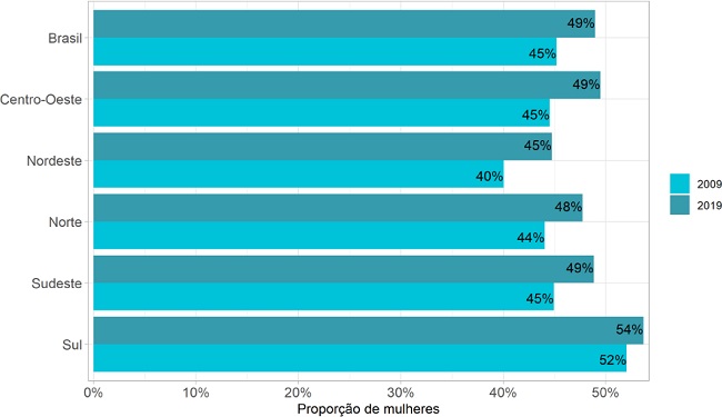 A participação feminina no total de empregados das atividades características do turismo no Brasil é de 49%. Esse percentual é sensivelmente maior na região Sul (54%) e menor no Nordeste (45%). A proporção de mulheres cresceu 4 pontos percentuais entre 2009 e 2019. Esse crescimento foi observado em todas as regiões, sendo menos intensa na região Sul. A proporção de mulheres nas ACTs no total nacional e por região do país é apresentada na Figura 2.
