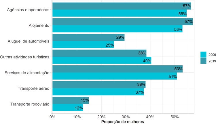 Quando analisada por atividade específica, nota-se que a proporção de mulheres é maior nas agências e operadoras de turismo e nos serviços de alojamento (57%). A participação feminina também é majoritária nos serviços de alimentação (53%). Nas demais atividades turísticas, o percentual de mulheres é inferior a 50%, chegando a apenas 15% no transporte rodoviário. A comparação entre os anos de 2009 e 2019 revela que a participação feminina no total das ACTs no Brasil cresceu 4 pontos percentuais, partindo de 45% para alcançar os atuais 49%. O percentual de mulheres cresceu em todas as atividades, exceto na categoria “outras atividades turísticas”. Nos serviços de alojamento e aluguel de automóveis, o crescimento da participação feminina foi de 4 pontos percentuais (Figura 3).