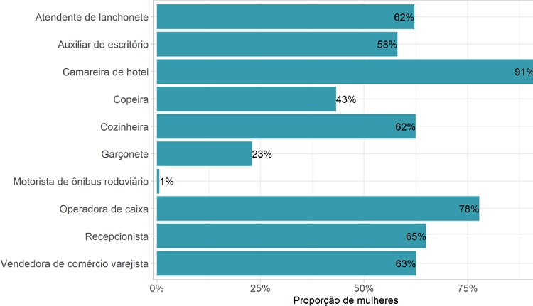 De acordo com os dados do Cadastur, as mulheres são ligeira maioria entre as guias de turismo (51%). As mulheres também são maioria entre os servidores do Ministério do Turismo (59%). A participação feminina no amplo conjunto de empresas de turismo varia substancialmente por ocupação específica. Consideradas as 10 ocupações mais frequentes nas empresas das ACTs, no extremo inferior, as mulheres representam apenas 1% dos motoristas de ônibus rodoviários. Por outro lado, 91% das camareiras são mulheres. As mulheres são maioria em 7 das 10 ocupações mais numerosas nas ACTs (Figura 4).