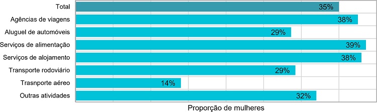 Apesar da considerável proporção de mulheres entre os trabalhadores do turismo, a participação feminina no empresariado turístico é minoritária. Os resultados elaborados a partir dos dados da Receita Federal indicam que apenas cerca de 35% de todos os sócios pessoas físicas de empresas de turismo no Brasil são mulheres (Figura 5). A proporção de mulheres é especialmente reduzida no transporte aéreo (14%). Outras atividades com participação feminina abaixo da média são o aluguel de automóveis (29%) e o transporte rodoviário (29%). As atividades com maior proporção de mulheres empresárias são agências de viagens (38%), serviços de alojamento (38%) e serviços de alimentação (39%).