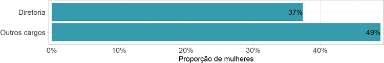 Entre as nove empresas de capital aberto listadas na bolsa de valores brasileira, a participação feminina nos conselhos de administração é de 11%. As mulheres não são maioria em nenhum conselho. Além disso, três empresas sequer têm mulheres em seus conselhos. A escassez de mulheres em posições de poder em empresas privadas também é evidenciada pelos dados da RAIS. As mulheres representam 37% das ocupações em empresas das ACTs que incluem os termos “diretor” ou “dirigente” em suas nomenclaturas segundo o CBO, enquanto nas demais ocupações as mulheres totalizam 49% (Figura 6).