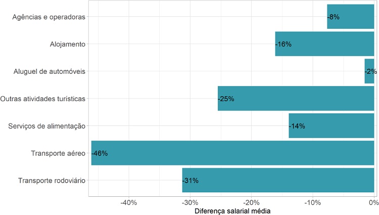 No que tange às atividades específicas, a desigualdade mais significativa é observada no transporte aéreo, atividade em que as mulheres recebem 46% a menos que os homens (Figura 8). No serviço de transporte rodoviário, a disparidade também é comparativamente elevada (-31%). Nos serviços de alimentação e na hotelaria, a diferença gira em torno de 15%. Os salários menos díspares são encontrados nas agências de viagens (-8%) e nas locadoras de automóveis (- 2%). Vale ressaltar que em nenhuma atividade as mulheres têm uma média salarial superior aos homens.