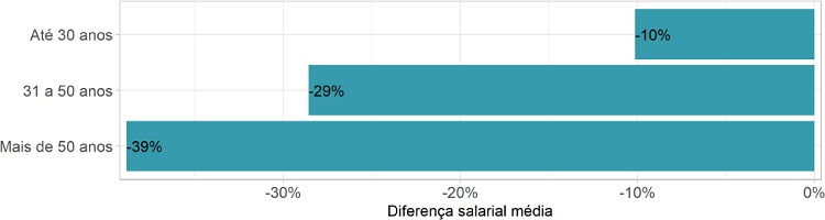 A diferença salarial entre mulheres e homens é mais acentuada para trabalhadoras acima dos 50 anos de idade (-39%) e mais branda para trabalhadoras mais jovens (Figura 9). Esse resultado é, de alguma forma, alentador, já que pode indicar uma tendência de redução das desigualdades de gênero entre as gerações mais recentes. Contudo, como a pesquisa é pontual no tempo, não há elementos para afirmar se a menor desigualdade salarial entre as pessoas mais jovens é efetivamente devida à geração, ou se revela uma estrutura salarial associada à idade e que pode persistir para as gerações futuras.