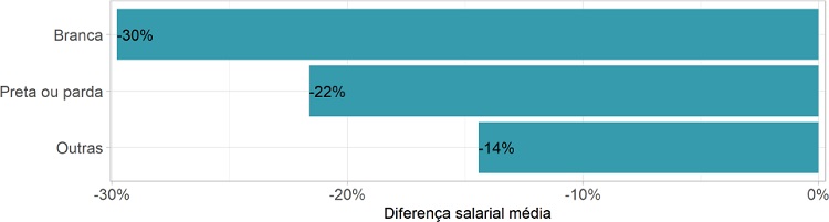 Entre as pessoas brancas, a inferioridade salarial das mulheres é maior (-30%), enquanto entre as pessoas pretas ou pardas essa desvantagem é mais tênue (-22%). A diferença é ainda menor para pessoas de outras cores ou raças (-14%) (Figura 10). Deve-se ressaltar que essas comparações são relativas a pessoas de diferentes sexos, mas da mesma cor ou raça. A comparação entre pessoas de diferentes cores ou raças revela uma grande desvantagem das mulheres negras e pardas em relação a todos os outros grupos. Mulheres negras e pardas ganham, em média, 19% a menos do que as mulheres brancas e 43% a menos do que os homens brancos. Além disso, os resultados corroboram as evidências apresentadas por Carvalho & Silva (2006) de que a desigualdade salarial de gênero no Brasil é maior entre brancos do que entre pretos ou pardos.