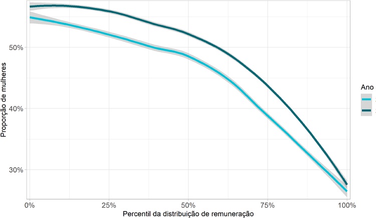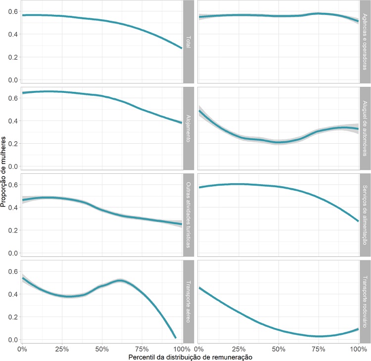 A redução da proporção de mulheres em empregos com salários mais altos é evidente em todas as atividades das ACTs, exceto nas agências de viagens. Os efeitos mais notáveis estão nas atividades de transporte aéreo e rodoviário. No entanto, apesar da tendência geral de queda da proporção de mulheres conforme os salários crescem, a relação entre as duas variáveis não é linear, e sequer monotônica. No caso do aluguel de automóveis, por exemplo, após uma tendência de queda a partir dos percentis mais baixos, a participação feminina volta a aumentar substancialmente para salários acima do percentil 70%. O padrão de variação é ainda mais complexo no transporte aéreo (Figura 12).