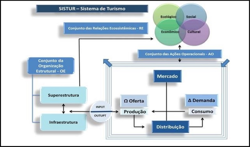 Em território nacional destaca-se o sistema proposto por Beni (1990), para quem a Teoria dos Sistemas tem como foco identificar os seus elementos com os respectivos atributos e as relações de causa e efeito. Reforça que, com a soma das partes, é possível obter um diagnóstico de todo o sistema turístico. Suas relações internas e externas a um sistema podem depender do sistema em si ou de seu ambiente, introduzindo a noção de regulação e de controle. Nesse sentido, deve apresentar uma real consolidação, ordenada e estruturada dos componentes do turismo, nomeado como SISTUR. Esse sistema contempla o conjunto das relações ecossistêmicas (ecológico, cultural, social, econômico), o conjunto das ações operacionais (mercado, distribuição, oferta, demanda), o conjunto da organização estrutural (com a infraestrutura e a superestrutura) (figura 2).