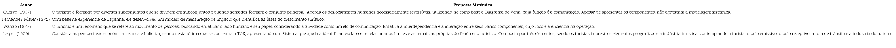Os suíços Walter Hunziker e Kurt Krapf, em 1942, forneceram uma compreensão elaborada do significado de turismo, reforçando-o como um conjunto de relações e fenômenos, assemelhando-se as bases da TGS ao enfatizarem as diversas partes que se relacionam para que o turismo se efetive – como deslocamento, turista, permanência, entre outras. A partir desses autores outros surgem favoráveis ao uso da TGS aplicada ao campo do turismo, como segue no quadro 1. Ressalta-se, contudo, que a maioria se utilizou da perspectiva sistêmica para a construção de seu raciocínio, não se prendendo aos rigores conceituais da TGS.