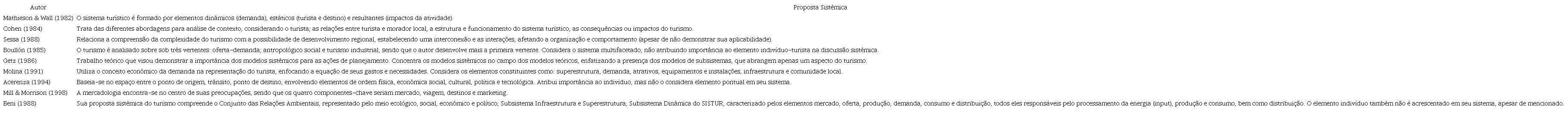 A demonstração dos principais estudos atrelados à perspectiva sistêmica do turismo é o primeiro passo para entender uma área que ainda avança teoricamente. Os modelos compartilham a preocupação de se estabelecer certa ordem para se entender o universo do turismo e sua complexidade. No início procuraram entender o turismo, enquanto na segunda etapa prevaleceu a análise econômica. Já na terceira análise, a expansão da interpretação sobre o turismo se evidencia, abrindo diversas portas para interpretação.