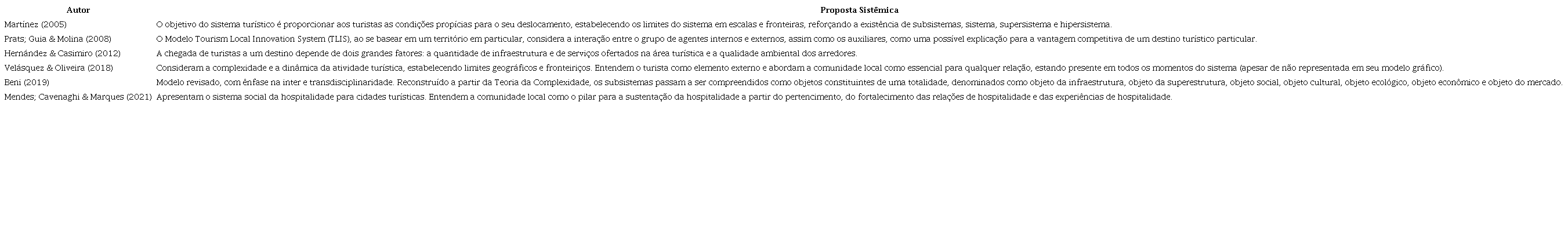 O estudo do turismo se aproximou das interpretações sistêmicas desde a década de 1960, quando se dissemina a compreensão de que este setor é um sistema composto por diversos elementos que interagem entre si. O surgimento de modelos sistêmicos para o turismo representa um fortalecimento dos estudos acadêmicos, avançando a compreensão de que o turismo é dependente de uma relação entre os ambientes econômico, político, social, ambiental, entre outros. Diversos autores da área já aprofundaram os estudos sobre os modelos, como Beni e Moesch (2017); Panosso Netto (2011); Palhares e Panosso Netto (2008); Martínez (2005); entre outros. Essas obras apresentam uma ampla exposição sobre os autores que adotaram a perspectiva sistêmica para compreender o turismo e seus componentes e são essenciais para o aprofundamento da temática.