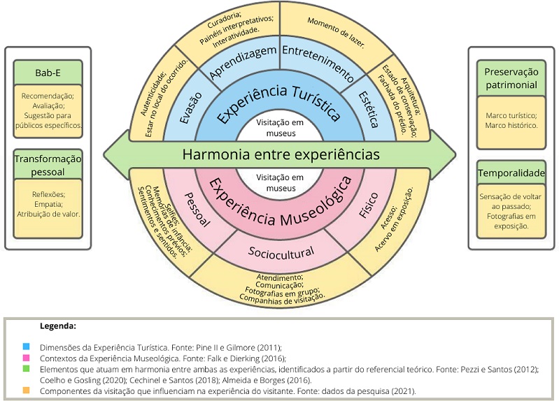A reflexão da experiência é resultado da convergência dos apontamentos de Pine e Gilmore (2011), que representaram as dimensões da experiência turística, e de Falk e Dierking (2016), que representaram as dimensões da experiência museológica. A partir dos apontamentos e da reflexão teórica, o estudo caracterizou mais quatro dimensões similares entre as experiências citadas, sendo elas: transformação pessoal, preservação patrimonial, boca-a-boca eletrônico e temporalidade.