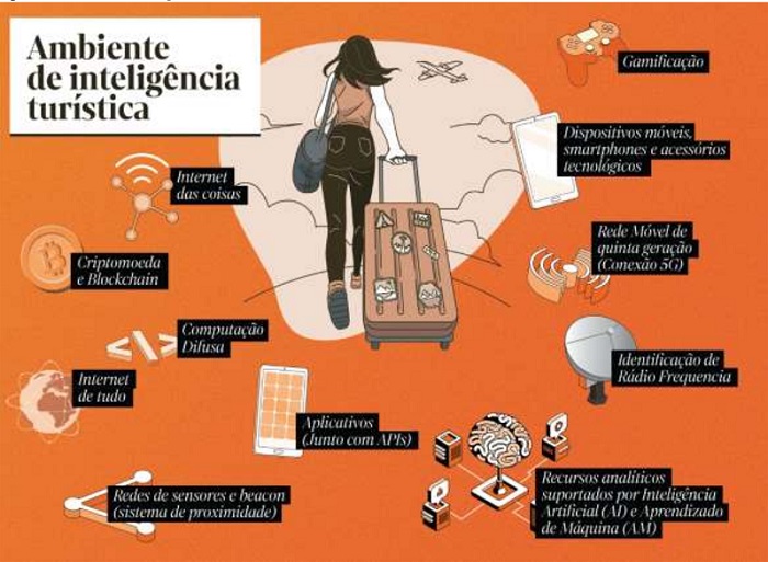 A Figura 01, apresentada por Buhalis (2019), mostra o Tourism Ambient Intelligence (Aml, 2020-futuro), impulsionado por uma série de tecnologias: Internet das Coisas, a Internet de tudo, rede móvel de quinta geração (5G); Identificação por radiofrequência (RFID); dispositivos móveis, smartphones e dispositivos vestíveis; Impressão 3D, aplicativos junto com APIs, criptomoeda e Blockchain, redes de sensores e beacon, computação pervasiva, gamificação, bem como recursos analíticos aprimorados com suporte de Inteligência Artificial (AI) e aprendizado de máquina (ML).