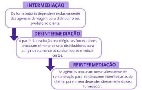 Durante o processo de intermediação, até a década de 1990, quando a internet começou a ser utilizada por empresas comerciais, as agências de viagem detinham as vendas de serviços turísticos e não possuíam concorrência, sendo o único meio de acesso dos clientes na realização de compra de uma viagem. Além disso, a relação direta entre os produtores e consumidores ainda era limitada, pois os investimentos em comunicação ainda eram escassos.
