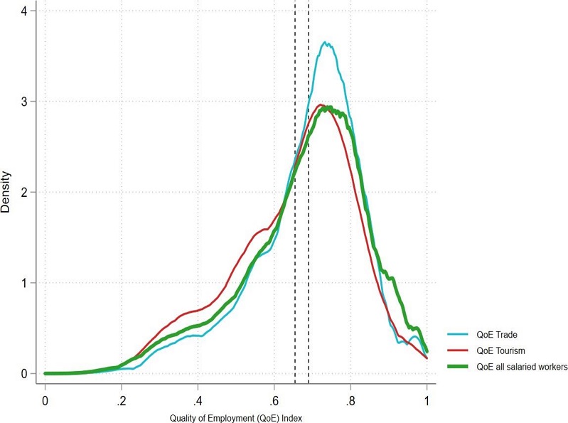A more in-depth discussion can be made based on Figure 1, which presents the density functions of the QoE index for tourism and trade employees. QoE in tourism shows a great dispersion in the distribution of employees, indicating the presence of more inequalities among these workers compared to those of trade. At the same time, there is a greater concentration of tourism workers for the lowest QoE levels (left of Figure 1) showing a more critical situation for these and in line with the literature (Stacey, 2015). Ultimately, the tourism sector presents a lower share of unskilled workers' and skilled gap, but is more unequal among his salaried workers than trade.