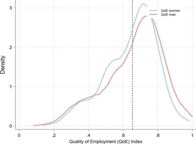 We found some particularities when it comes to sex differences. The QoE index density functions for tourism employees shows the presence of a sex-based difference in employment quality against women, following the general and the tourism literature for the Spanish case (Santero-Sanchez et al., 2015). This sex gap disappears (and slightly reverses) in the first stretch of the QoE distribution —i.e. among those salaried workers that face the worst QoE conditions (Figure 2). This particular result, women in tourism-related activities facing better quality employment in low quality jobs, settles down the bases for working conditions not good enough and induces to a self-selection process into other forms of employment for women in the sector, such as self-employment or entrepreneurship. This is an hypothesis that deserves further research to understand the job and socioeconomic characteristics of these workers and try to shed light onto this phenomenon because, as stated before, tourism has a female participacion of 4.2 percentage points greater than trade. In countries like Spain, Portugal and Argentina there is evidence pointing towards the phenomenon of occupational segregation by sex in activities related to the tourism sector (Campos Soria et al., 2011; Costa et al., 2011; Espinola, 2016; 2020) which is related to this result.