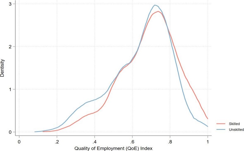 Besides gender disparities, we also take a look at how skilled and unskilled workers comparatively perform. On average, we find that skilled workers performed better than unskilled, which is supported by the fact that most unskilled employees concentrate towards the left of the density distribution function while this function remains above that of the skilled workers. Still, there is an important proportion of skilled tourism workers to the left of the distribution, meaning that also for them QoE remains low. This result is particularly important since unskilled workers represent 82.2% of the tourism workforce (Table A.6). Furthermore, It is worth noting that, according to the United WTO and CEGOS (2019), it is recommended that tourism policies foster an increase in the investment towards education and skills development in the sector. Still, this result sheds light on the fact that such education should be acknowledged and rewarded by greater job quality, providing the adequate incentives for people to invest in skills development. In this line, Uruguay has launched a Tourism Training Catalog in 202111 based on the efforts of the Ministry of Tourism with other institutions, which collects the ultimate technical and university degrees, public and private courses in activities related to tourism. The purpose is to facilitate an upskilling process for people who want to enter the labor market in activities related to tourism, and ultimately improve the quality of tourism services offered by the country.