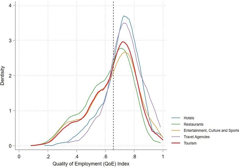 Diving deeper into these disparities, there is no doubt that tourism is a heterogeneous sector: even considering solely those subsectors that could be related to tourism activities, we found that these are highly varied. Although we are aware that it is difficult to discern whether all the restaurants and entertainment services represent salaried workers related to tourism activities, we use it as a proxy to the tourism sector. When we take a look at these subsectors separately (Table 3), we see that both restaurants and entertainment (the latter comprising entertainment, culture and sports) are the subsectors that present the greatest incidence of poor QoE levels among their employees. These are, at the same time, the subsectors where most tourism workers perform their duties. Hotels and Travel agencies, on the other hand, perform better and present a lower dispersion in their density functions. In fact, only 0.5% of all tourism workers are employed by travel agencies, which performs the best. These results may be related to the own characteristics of each of these subsectors in terms of working hours and shifts and informality.