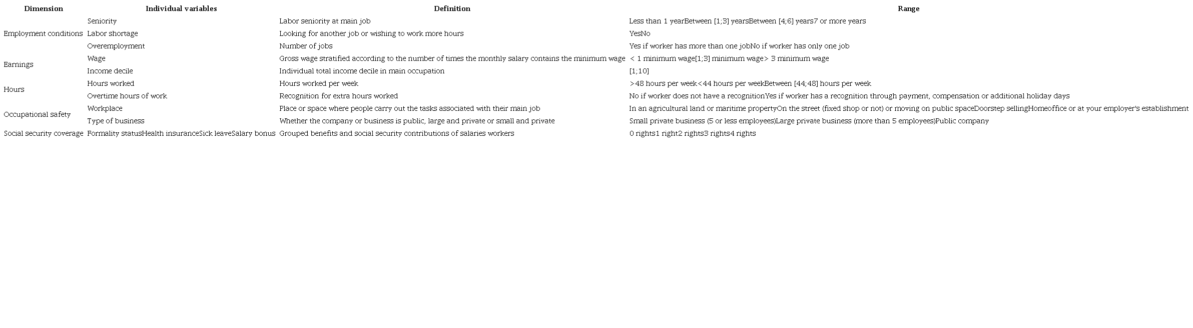 As outlined in Section 2, measuring employment quality implies considering numerous aspects of working conditions. The selection of individual variables included in our QoE index is based on conceptual foundations from the framework developed by the United Nations Economic Commission for Europe (2015) and the OECD (in Cazes et al., 2015) and tailored to data availability in Uruguay. Thus, quality of employment is considered in five specific dimensions: (i) employment conditions, (ii) earnings, (iii) hours, (iv) occupational safety and health and (v) social security coverage. All individual variables are ordered from lowest to highest quality of employment based on the literature review (Table 1).