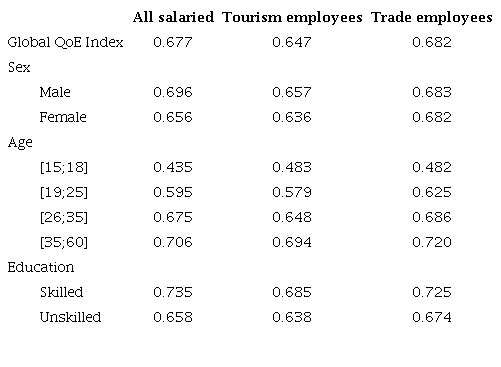 When QoE is analyzed by sex, we found a gender gap for the whole economy and for the tourist’s employees. Indeed, salaried womens present an average QoE index of 0.65 while this average is 0.69 for males workers in the whole economy. Although we had not find a sex-based gap in QoE in the trade sector, salaried women that work in activities related to tourism presented an average QoE of 0.636 while the mean value for man is 0.657. The sex-gap in employment’s quality among tourists’ workers constitutes an interesting insight for future research, as activities related to tourism are ussualy characterized by particulary attracting female workers, being this result particularly relevant for Uruguay’s labor market dynamic because tourism is a more feminized sector when compared to trade.