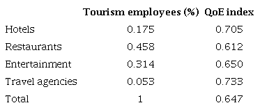 Santero-Sanchez et al. (2015) developed a Composite Index of Job Quality (CIJQ) for the tourism industry from a longitudinal sample on labor life for Spain in 2011. Based on a PCA analysis, they included several aspects of QoE: length of the working week (which has the greatest weight in the index), duration of employment, days worked in the year, the inverse of the number of contracts held and the total gross wage. Their main finding is that women hold lower quality jobs than men in the Spanish tourism industry and that the gender gap widens with age.