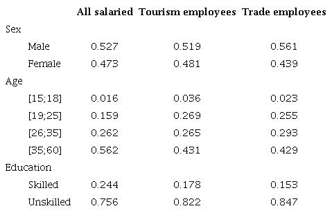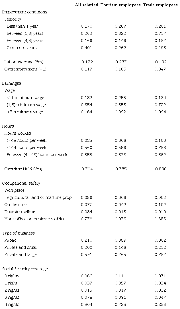 Furthermore, the proportion of employees under 25 years old (and over 15) is 17.5% for the whole economy, with considerable differences between salaried workers in tourism and trade. Indeed, 30.5% of salary earners in tourism are under 25 while they account for roughly 28% in trade. Regarding employees’ education, we identify skilled workers as those who had an incomplete college degree or higher educational level. Among the whole salaried workers in Uruguay, skilled workers account for 24.4% of the employment whilst their share in tourism employment is 17.8% and 15.3% in the trade sector. Overall, both sectors concentrate higher shares of young unskilled workers when compared to the whole economy.