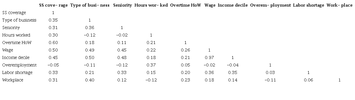 The occupational safety dimension (iv) is captured by two individual variables: the specific workspace where employees carry out their work tasks and the type of business. Based on Pineda & Acosta (2011), we grouped the workspace into four categories in ascending order, from negative to positive quality: working in an agricultural land or maritime property, a job on the street (regardless of whether you work on fixed shop or not) where the employee could be more exposed to robberies or traffic accidents, doorstep selling, and working from home or in an office.