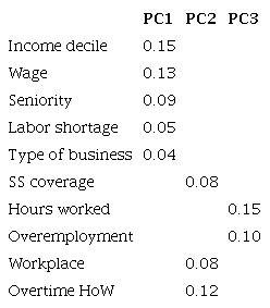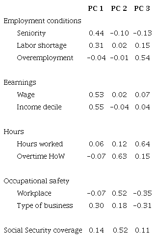 Based on our aim to approach the wide-ranging dimensions of quality of employment into a QoE index, we use a PCA as an appropriate data reduction technique to condense the various aspects associated to working conditions. As ILO (2016) recognizes that individual numerical indicators cannot adequately capture the qualitative nature of many aspects of decent work, we aim to combine the available information in the ECH 2016-2019 microdata as objectively as possible.