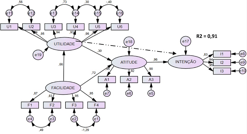 Por fim, a relação entre “Atitude” e “Intenção de uso” revelou-se significativa, tendo a H5 confirmada, a qual indica que a atitude de usar criptomoedas influencia positivamente a intenção dos gestores de utilizá-las como forma de pagamento no trabalho. Isto significa que ao obter uma avaliação positiva do uso de criptomoedas, consequentemente estes gestores possuem intenção de utilizá-las. Acresce que, a dimensão intenção de uso é explicada pelas dimensões que a antecedem, sendo intermediadas pela dimensão atitude, tendo uma explicação de 91% (R²=0,91), isto é, as dimensões representam consideravelmente a intenção dos gestores de empreendimentos turísticos de utilizar criptomoedas como forma de pagamento no trabalho.
